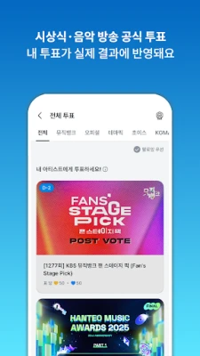 A FANCAST-tal a rajongói aktivitás többé nem csak passzív részvétel. Légy te is a változás motorja! Egyszerű napi bejelentkezésekkel, rövid hirdetések megtekintésével vagy játékos küldetések teljesítésével értékes szavazati forrásokat és belépőjegyeket gyűjthetsz. Ezeket felhasználva közvetlenül befolyásolhatod a K-Chart alakulását a KBS Music Bank hivatalos szavazásain, vagy segítheted kedvencedet, hogy elnyerje a FAN'S STAGE PICK vagy a Korea Grand Music Awards (KGMA) rangos elismeréseit. Szavazz tematikus listákra, figyeld valós időben az eredményeket, és ünnepeld együtt a globális közösséggel az aktuális hét vagy hónap legjobbjait. Ne maradj le a Hanteo Music Awards 2025 vagy a Jupiter Music Awards izgalmairól sem, ahol a te voksod is számít!