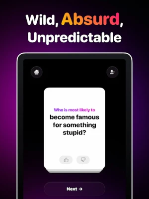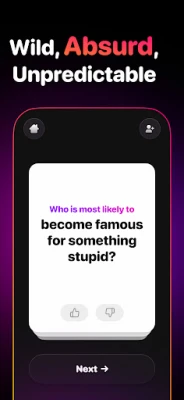 Most Likely To – a vad felnőtt partijáték. Fedezd fel, mit gondolnak barátaid rólad, és ki a legvalószínűbb az őrült dolgokra. Tökéletes házibulikra, előpartikra és minden más összejövetelre. Nevessetek együtt a barátok gondolatain!